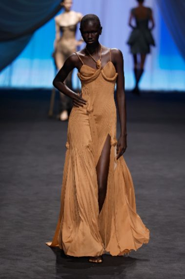 Sfila alla Paris Fashion Week la collezione Haute Couture Primavera/Estate 2025 Jean Paul Gaultier firmata da Ludovic de Saint Sernin, designer che porta in passerella moderne sirene che indossano corsetti stringati, abiti a rete e lunghi modelli in morbido chiffon plissettato o completi e tubini in pelle nera effetto cocco.