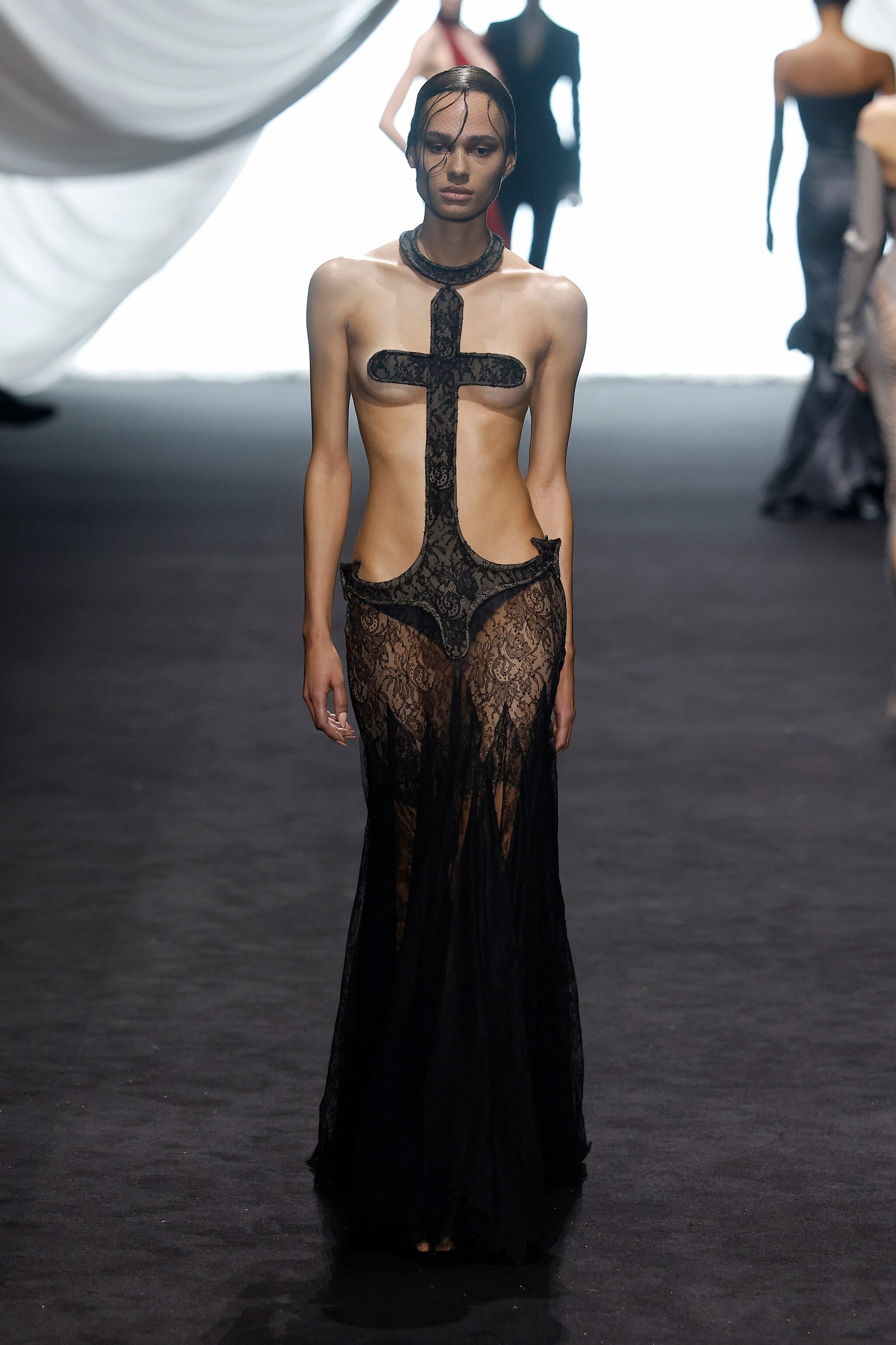 Sfila alla Paris Fashion Week la collezione Haute Couture Primavera/Estate 2025 Jean Paul Gaultier firmata da Ludovic de Saint Sernin, designer che porta in passerella moderne sirene che indossano corsetti stringati, abiti a rete e lunghi modelli in morbido chiffon plissettato o completi e tubini in pelle nera effetto cocco.