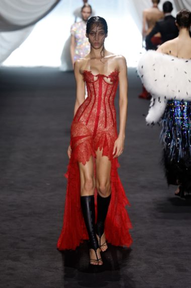 Sfila alla Paris Fashion Week la collezione Haute Couture Primavera/Estate 2025 Jean Paul Gaultier firmata da Ludovic de Saint Sernin, designer che porta in passerella moderne sirene che indossano corsetti stringati, abiti a rete e lunghi modelli in morbido chiffon plissettato o completi e tubini in pelle nera effetto cocco.