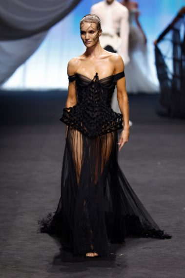 Sfila alla Paris Fashion Week la collezione Haute Couture Primavera/Estate 2025 Jean Paul Gaultier firmata da Ludovic de Saint Sernin, designer che porta in passerella moderne sirene che indossano corsetti stringati, abiti a rete e lunghi modelli in morbido chiffon plissettato o completi e tubini in pelle nera effetto cocco.