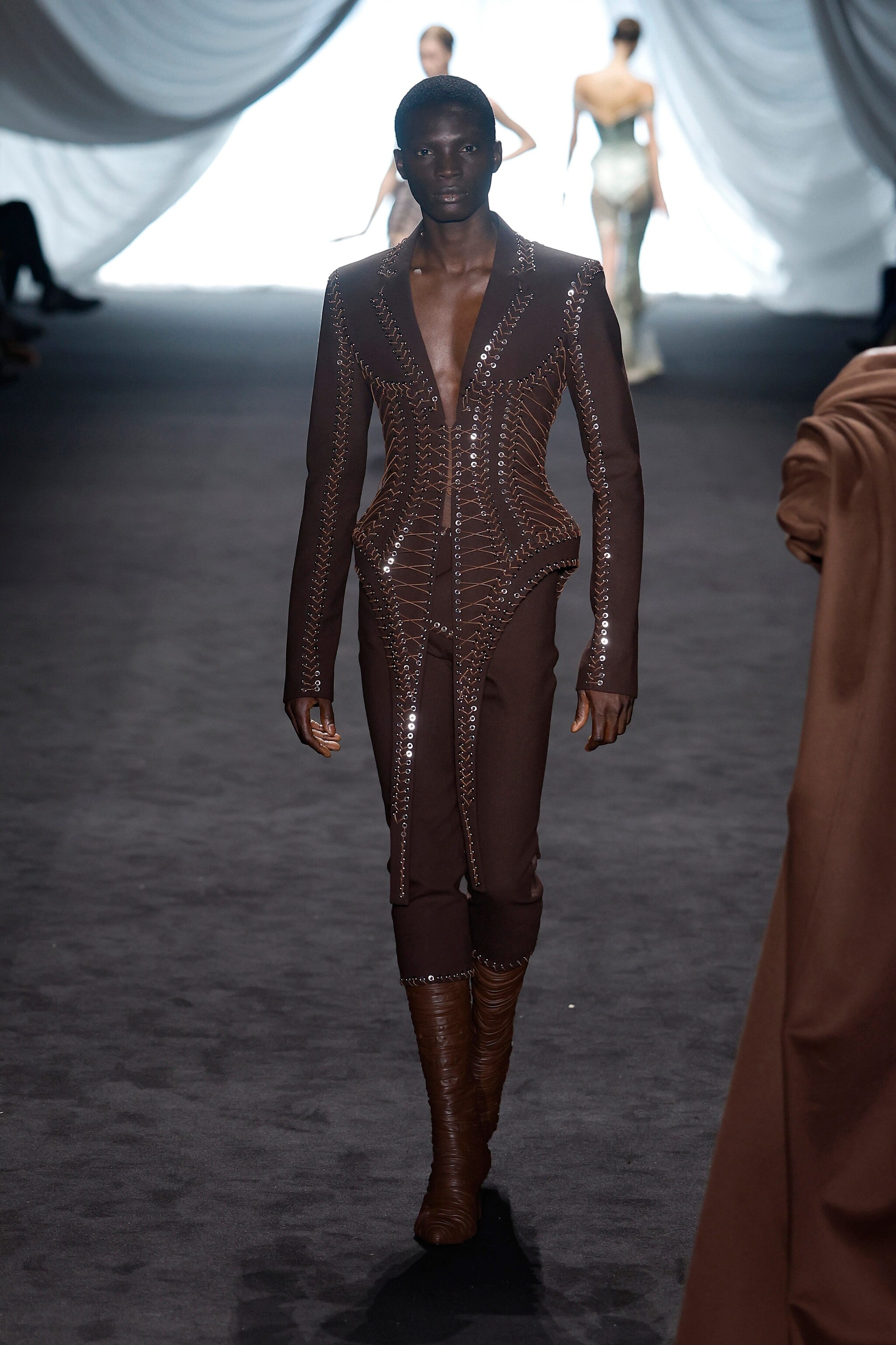 Sfila alla Paris Fashion Week la collezione Haute Couture Primavera/Estate 2025 Jean Paul Gaultier firmata da Ludovic de Saint Sernin, designer che porta in passerella moderne sirene che indossano corsetti stringati, abiti a rete e lunghi modelli in morbido chiffon plissettato o completi e tubini in pelle nera effetto cocco.