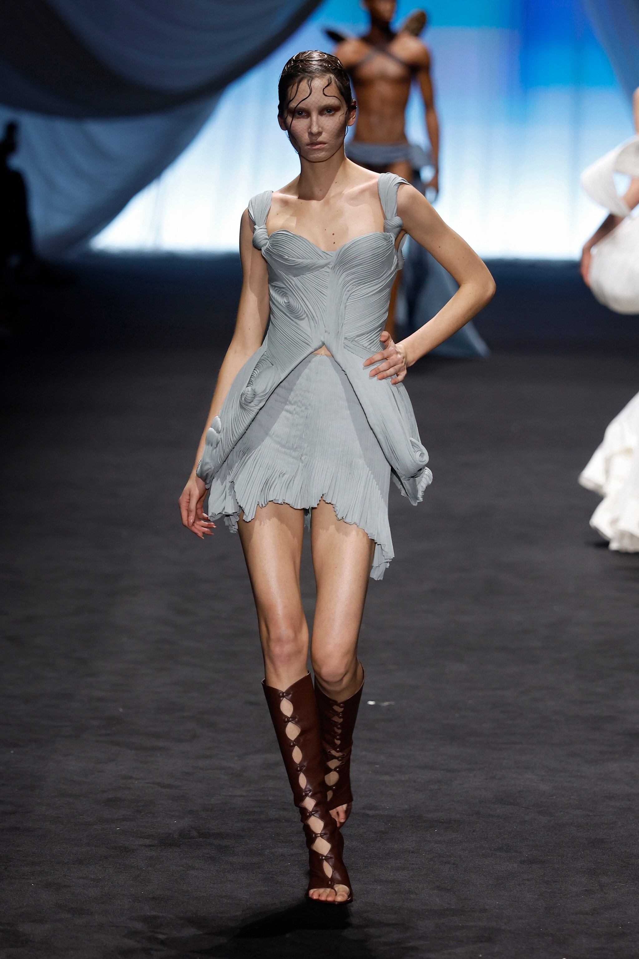 Sfila alla Paris Fashion Week la collezione Haute Couture Primavera/Estate 2025 Jean Paul Gaultier firmata da Ludovic de Saint Sernin, designer che porta in passerella moderne sirene che indossano corsetti stringati, abiti a rete e lunghi modelli in morbido chiffon plissettato o completi e tubini in pelle nera effetto cocco.