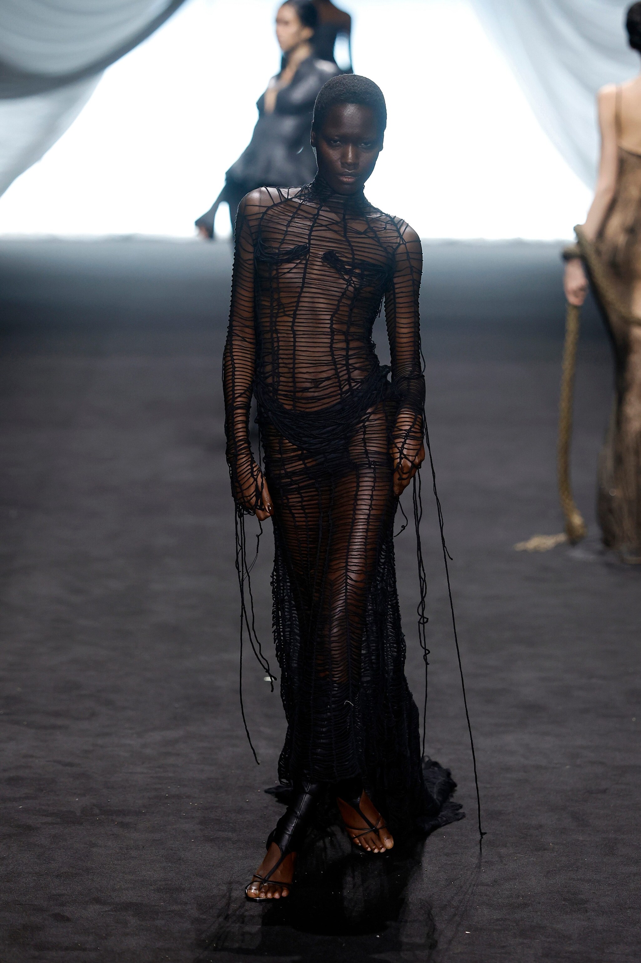 Sfila alla Paris Fashion Week la collezione Haute Couture Primavera/Estate 2025 Jean Paul Gaultier firmata da Ludovic de Saint Sernin, designer che porta in passerella moderne sirene che indossano corsetti stringati, abiti a rete e lunghi modelli in morbido chiffon plissettato o completi e tubini in pelle nera effetto cocco.