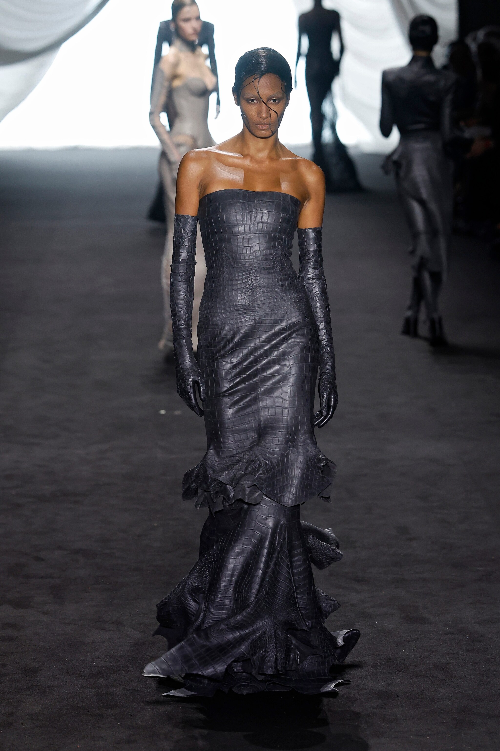 Sfila alla Paris Fashion Week la collezione Haute Couture Primavera/Estate 2025 Jean Paul Gaultier firmata da Ludovic de Saint Sernin, designer che porta in passerella moderne sirene che indossano corsetti stringati, abiti a rete e lunghi modelli in morbido chiffon plissettato o completi e tubini in pelle nera effetto cocco.