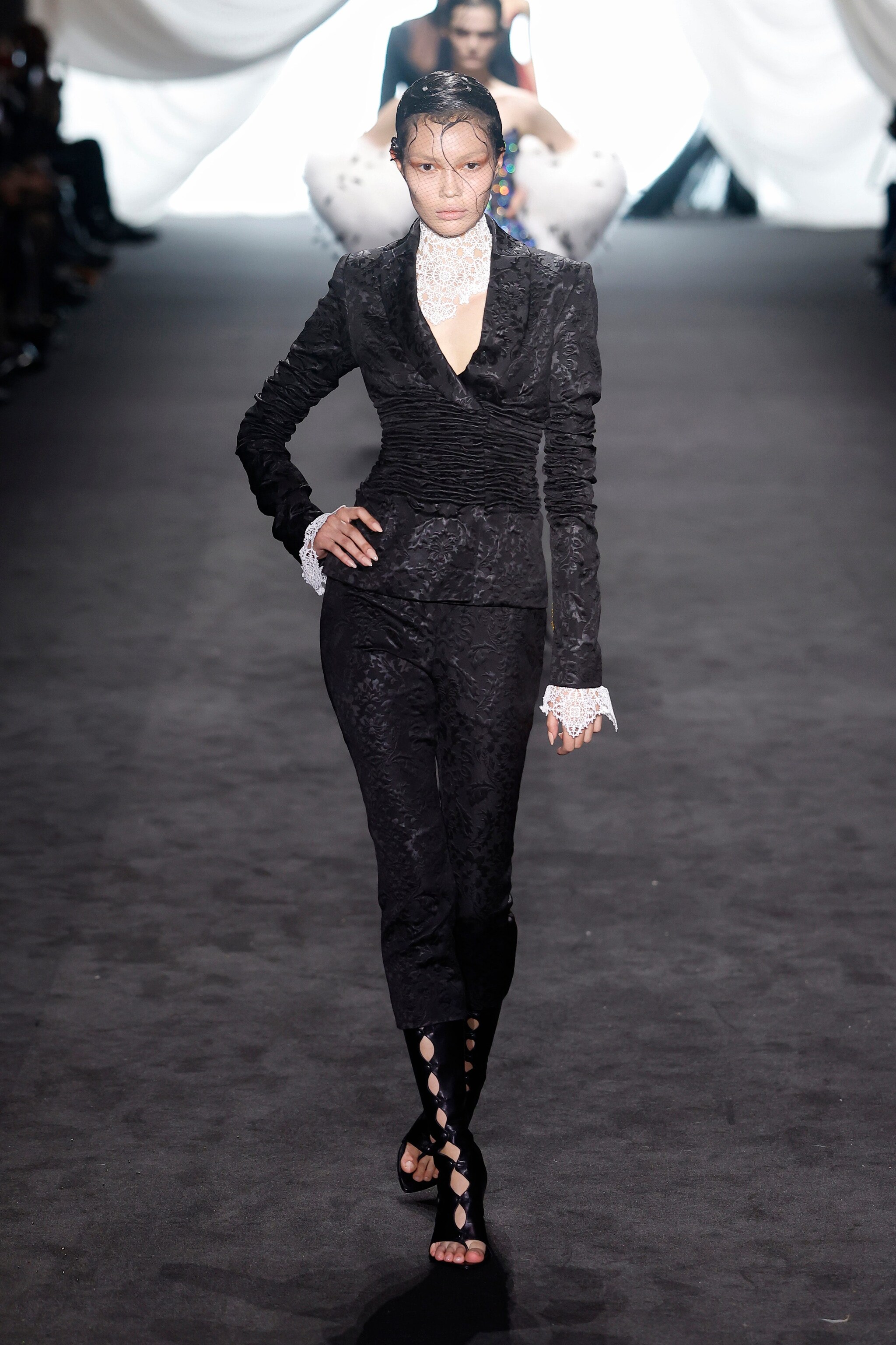 Sfila alla Paris Fashion Week la collezione Haute Couture Primavera/Estate 2025 Jean Paul Gaultier firmata da Ludovic de Saint Sernin, designer che porta in passerella moderne sirene che indossano corsetti stringati, abiti a rete e lunghi modelli in morbido chiffon plissettato o completi e tubini in pelle nera effetto cocco.
