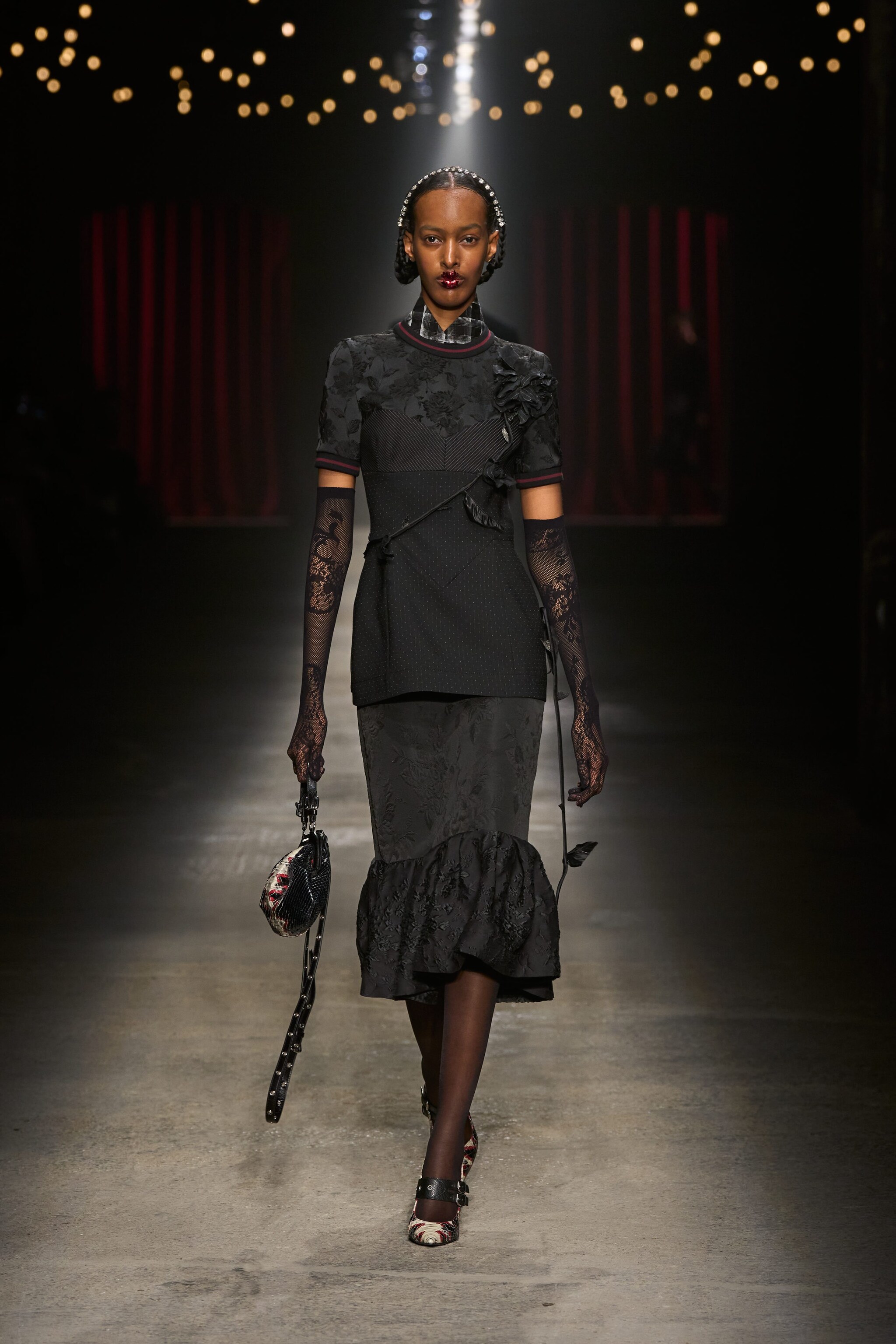 Completi in pelle nera e tubini drappeggiati vedo non vedo si alternano a completi in gessato o con fantasie check e abiti con fantasie floreali sulla passerella Autunno/Inverno 2025-2026 di Antonio Marras alla Milano Fashion Week