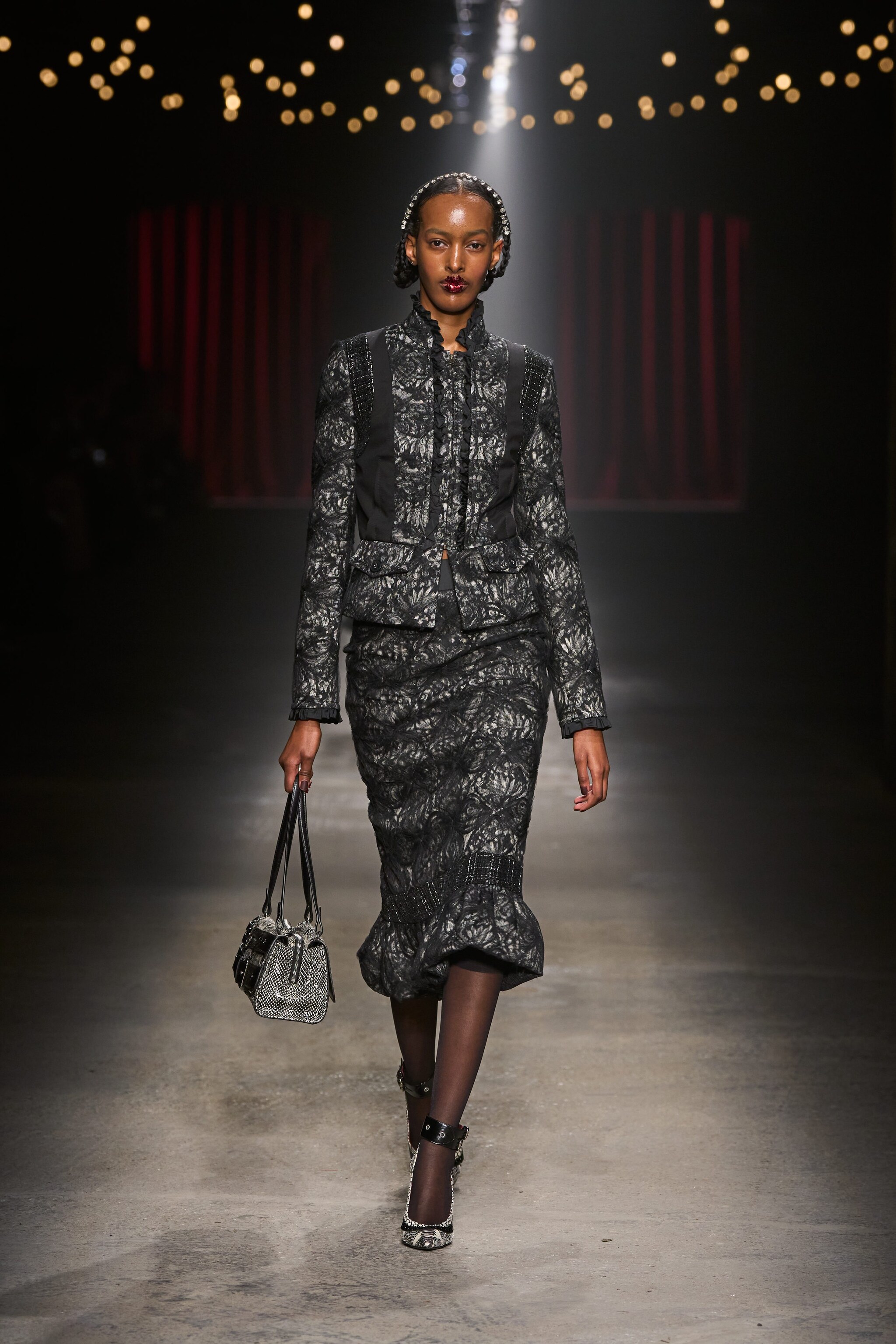 Completi in pelle nera e tubini drappeggiati vedo non vedo si alternano a completi in gessato o con fantasie check e abiti con fantasie floreali sulla passerella Autunno/Inverno 2025-2026 di Antonio Marras alla Milano Fashion Week