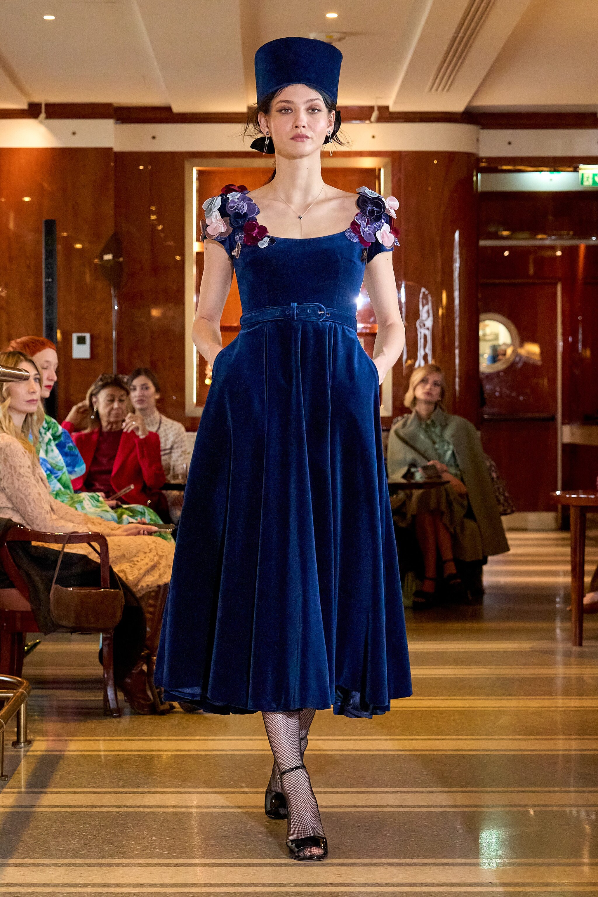 Pizzi alternati a velluto, cristalli, fiori e pois, completi pantalone e outfit con mini pullover in lana e romantiche gonne a ruota sfilano alla Milano Fashion Week sulla passerella Autunno/Inverno 2025-2026 di Luisa Beccaria