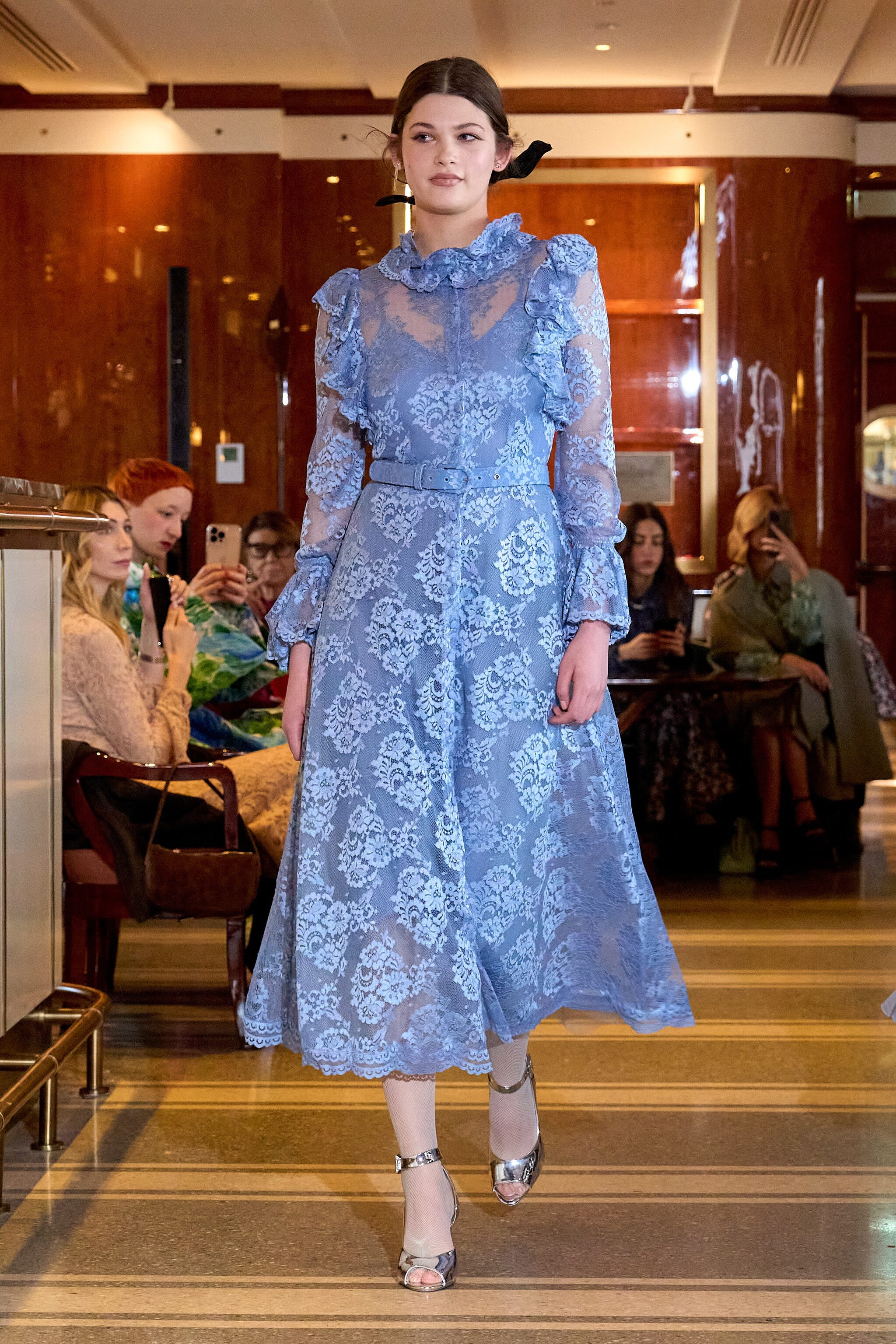 Pizzi alternati a velluto, cristalli, fiori e pois, completi pantalone e outfit con mini pullover in lana e romantiche gonne a ruota sfilano alla Milano Fashion Week sulla passerella Autunno/Inverno 2025-2026 di Luisa Beccaria