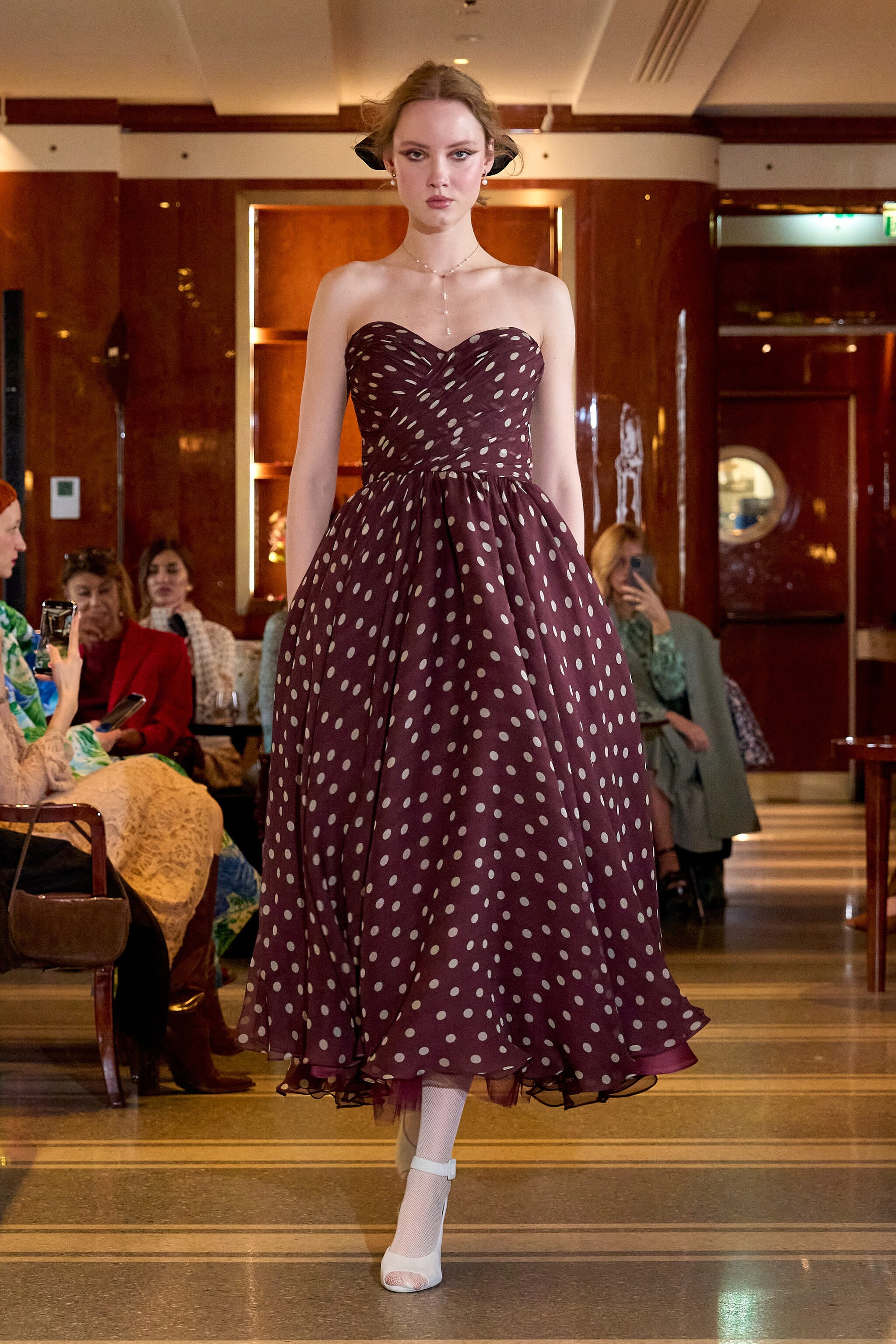 Pizzi alternati a velluto, cristalli, fiori e pois, completi pantalone e outfit con mini pullover in lana e romantiche gonne a ruota sfilano alla Milano Fashion Week sulla passerella Autunno/Inverno 2025-2026 di Luisa Beccaria