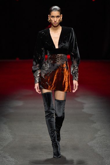 Fausto Puglisi celebra Pompei, i suoi affreschi e il tipico rosso pompeiano nella collezione Autunno/Inverno 2025-2026 disegnata per Roberto Cavalli in cui appaiono stampe con lava, look animalier e abiti in velluto