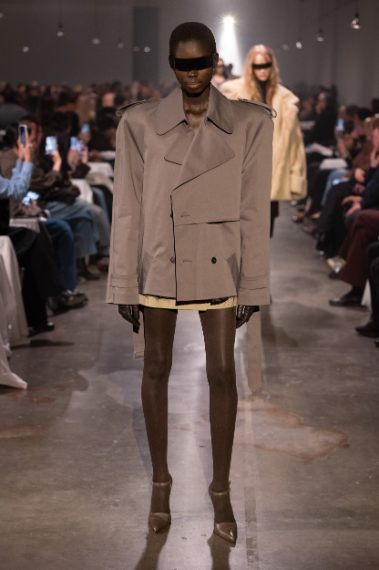 Polo e camicie dalle spalle appuntite abiti che sembrano trench, mini dress in suede e blazer oversize sfilano alla Milano Fashion Week sulla passerella Autunno/Inverno 2025-2026 di MM6 Maison Margiela.