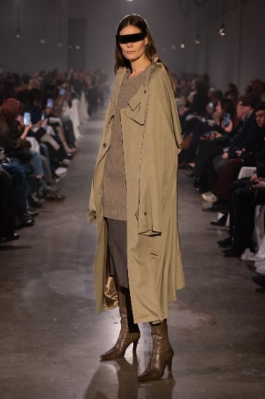 Polo e camicie dalle spalle appuntite abiti che sembrano trench, mini dress in suede e blazer oversize sfilano alla Milano Fashion Week sulla passerella Autunno/Inverno 2025-2026 di MM6 Maison Margiela.
