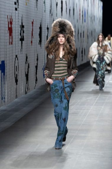 Le linee bold di colbacchi maxi, cappotti pelosi e bomber con frange in lana si mescolano con fantasie floreali, macro paillettes e colori forti come il giallo nella collezione Autunno/Inverno 2025-2026 disegnata da Marco De Vincenzo per Etro