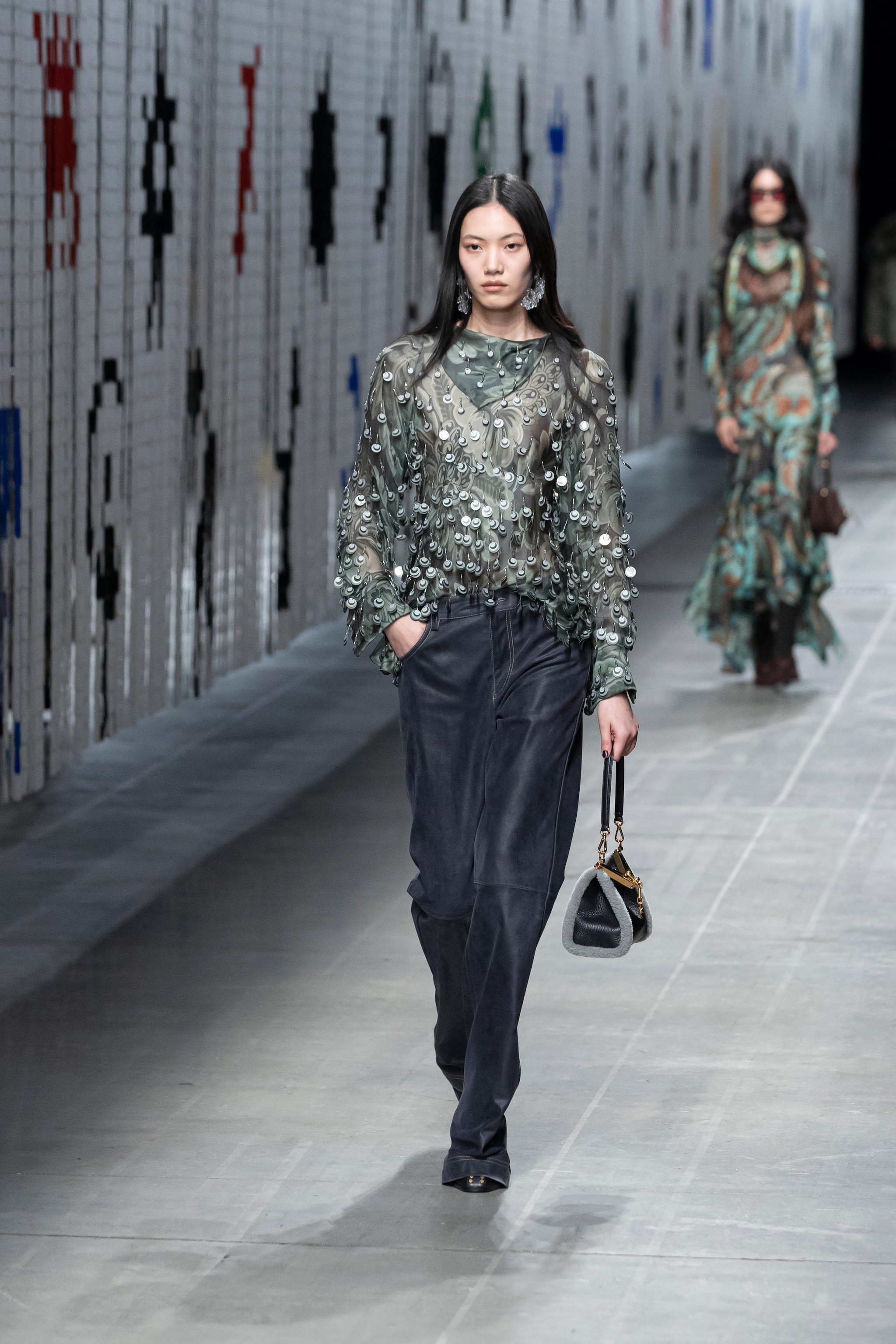 Le linee bold di colbacchi maxi, cappotti pelosi e bomber con frange in lana si mescolano con fantasie floreali, macro paillettes e colori forti come il giallo nella collezione Autunno/Inverno 2025-2026 disegnata da Marco De Vincenzo per Etro