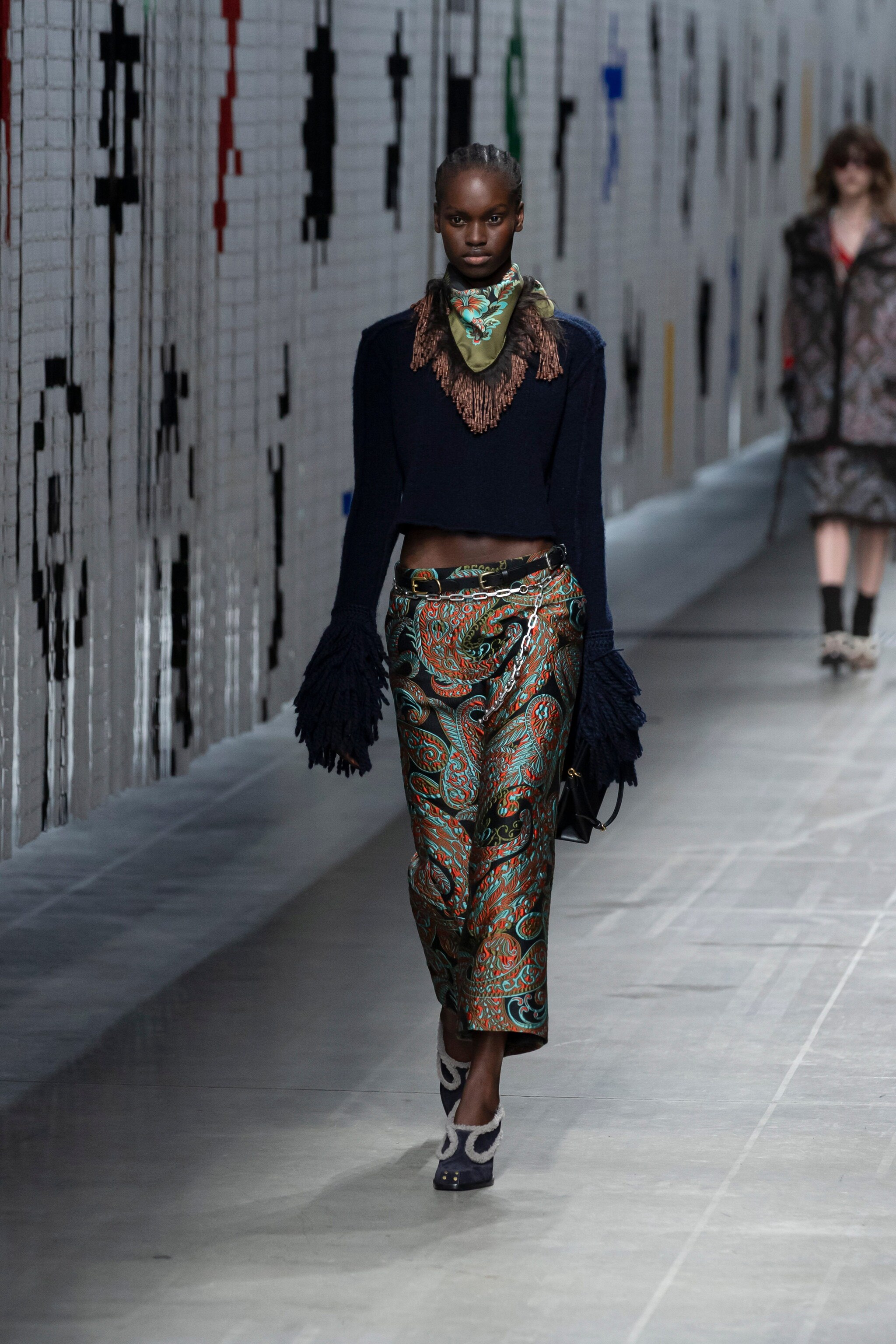 Le linee bold di colbacchi maxi, cappotti pelosi e bomber con frange in lana si mescolano con fantasie floreali, macro paillettes e colori forti come il giallo nella collezione Autunno/Inverno 2025-2026 disegnata da Marco De Vincenzo per Etro