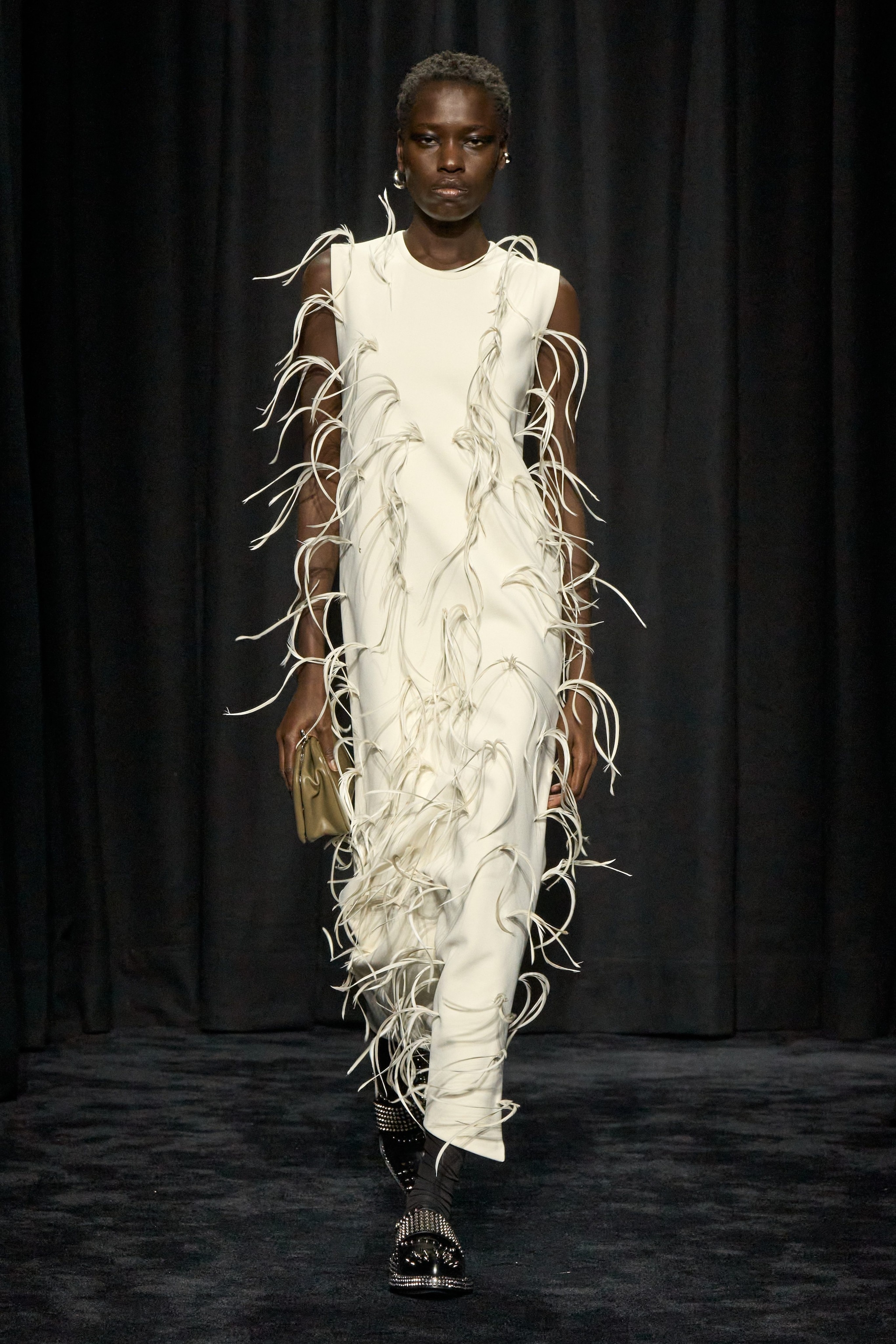 Lunghe frange, cascate di paillettes, fiocchi, dettagli in pelliccia e look in pelle colorato sfilano alla Milano Fashion Week sulla passerella Autunno/Inverno 2025-2026 di Jil Sander