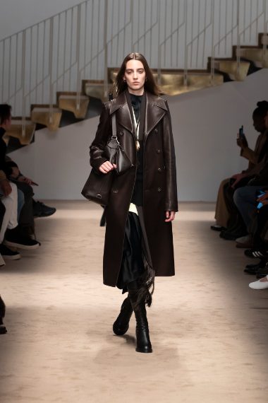 Blazer e cappotti doppiopetto, trench in pelle, giacche oversize e look in full melange sfilano alla Milano Fashion Week sulla passerella Autunno/Inverno 2025-2026 di Tod's