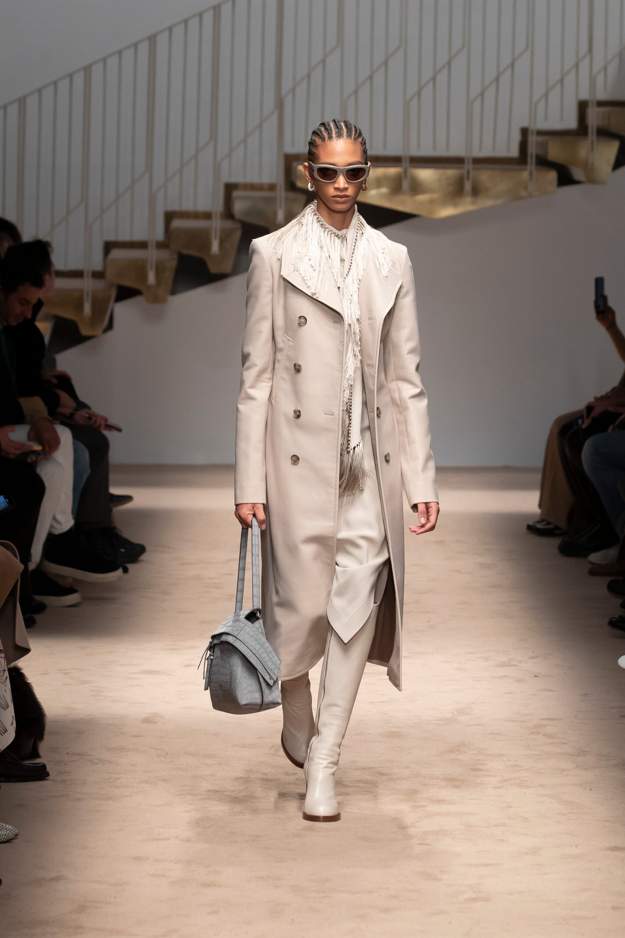 Blazer e cappotti doppiopetto, trench in pelle, giacche oversize e look in full melange sfilano alla Milano Fashion Week sulla passerella Autunno/Inverno 2025-2026 di Tod's