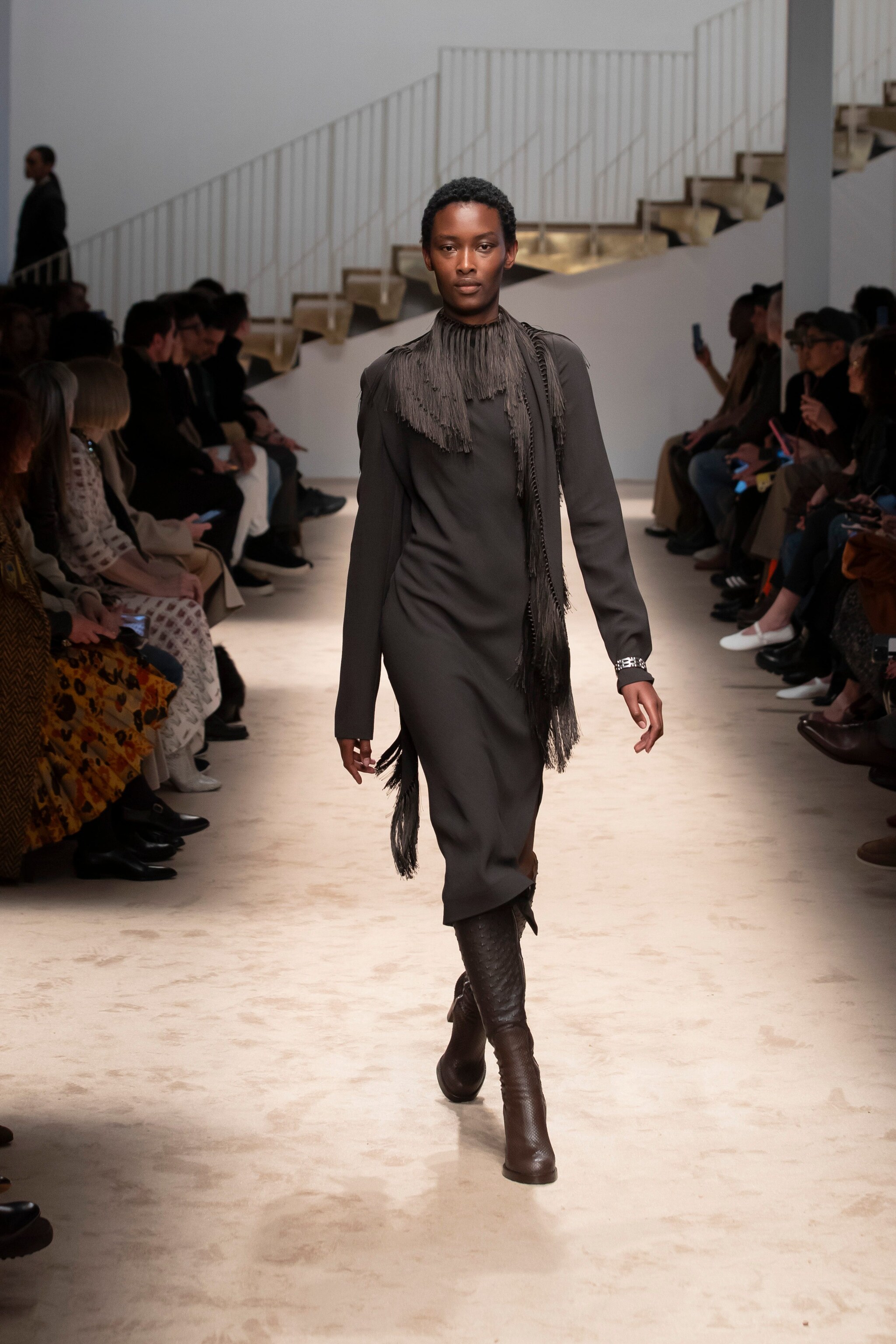 Blazer e cappotti doppiopetto, trench in pelle, giacche oversize e look in full melange sfilano alla Milano Fashion Week sulla passerella Autunno/Inverno 2025-2026 di Tod's
