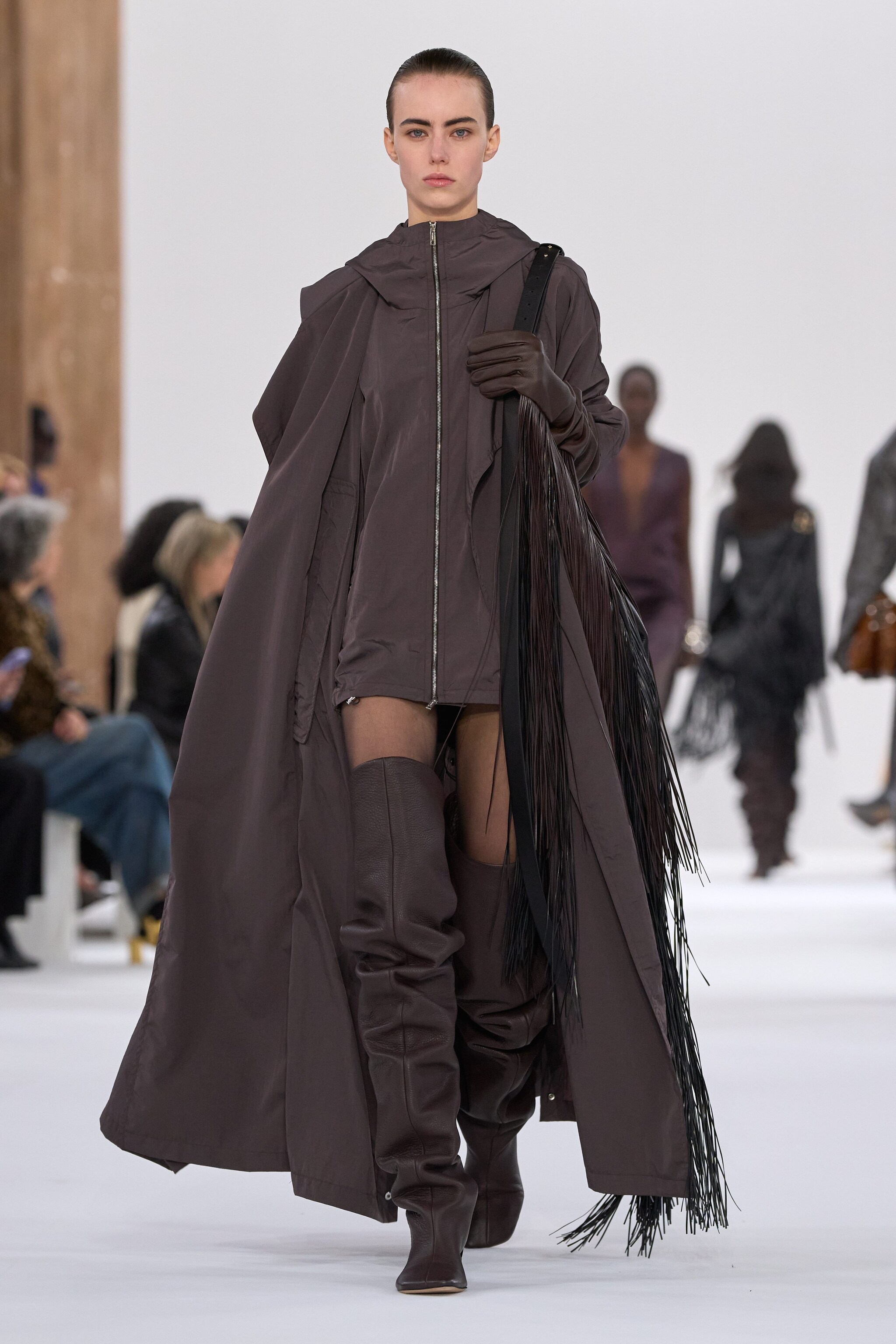 Lunghe frange su abiti e borse, morbidi midi dress drappeggiati in lana o seta in ocra o rosso fuoco e voluminose pellicce sfilano alla Milano Fashion Week sulla passerella Autunno/Inverno 2025-2026 di Tod's