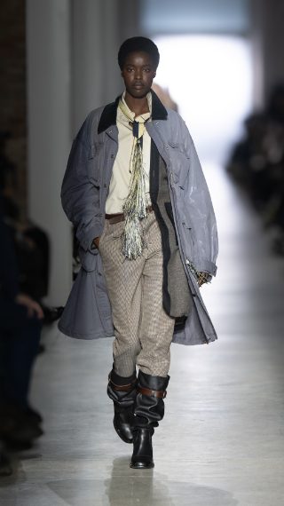 Giacche corte e dalle linee rigorose, maglioni argylle, cappotti sciancrati, gonne asimmetriche e maxi cardigan in lana dalla trama grossa sfilano alla Milano Fashion Week sulla passerella Autunno/Inverno 2025-2026 di Onitsuka Tiger
