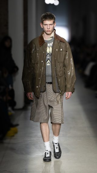 Giacche corte e dalle linee rigorose, maglioni argylle, cappotti sciancrati, gonne asimmetriche e maxi cardigan in lana dalla trama grossa sfilano alla Milano Fashion Week sulla passerella Autunno/Inverno 2025-2026 di Onitsuka Tiger