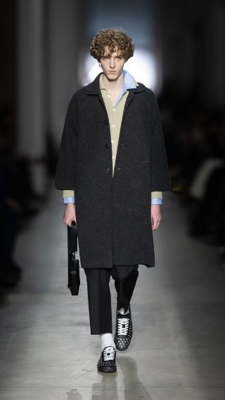 Giacche corte e dalle linee rigorose, maglioni argylle, cappotti sciancrati, gonne asimmetriche e maxi cardigan in lana dalla trama grossa sfilano alla Milano Fashion Week sulla passerella Autunno/Inverno 2025-2026 di Onitsuka Tiger