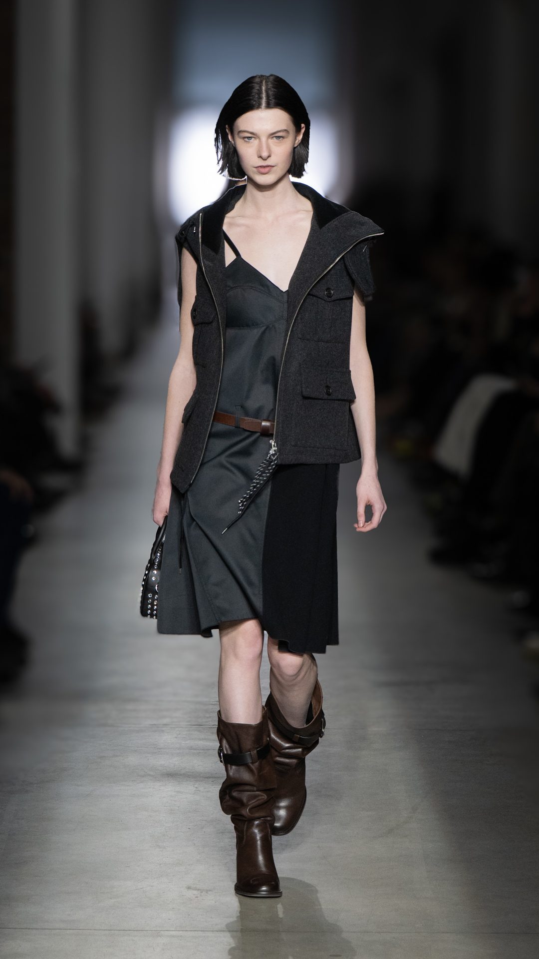 Giacche corte e dalle linee rigorose, maglioni argylle, cappotti sciancrati, gonne asimmetriche e maxi cardigan in lana dalla trama grossa sfilano alla Milano Fashion Week sulla passerella Autunno/Inverno 2025-2026 di Onitsuka Tiger