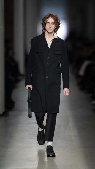 Giacche corte e dalle linee rigorose, maglioni argylle, cappotti sciancrati, gonne asimmetriche e maxi cardigan in lana dalla trama grossa sfilano alla Milano Fashion Week sulla passerella Autunno/Inverno 2025-2026 di Onitsuka Tiger