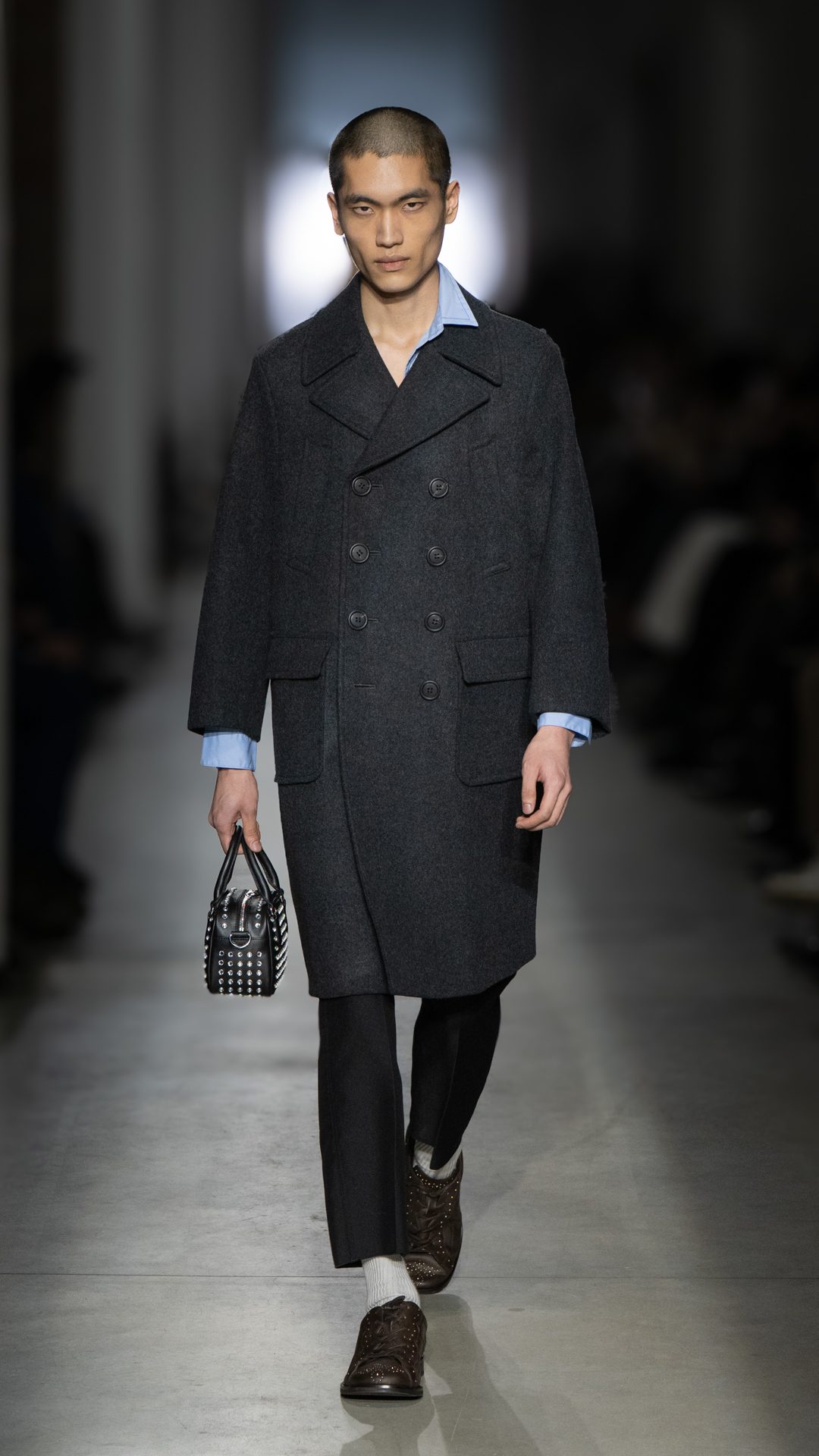 Giacche corte e dalle linee rigorose, maglioni argylle, cappotti sciancrati, gonne asimmetriche e maxi cardigan in lana dalla trama grossa sfilano alla Milano Fashion Week sulla passerella Autunno/Inverno 2025-2026 di Onitsuka Tiger
