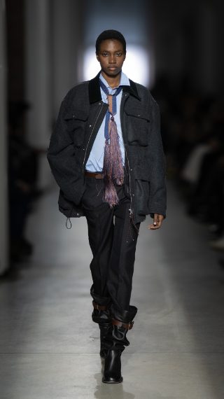 Giacche corte e dalle linee rigorose, maglioni argylle, cappotti sciancrati, gonne asimmetriche e maxi cardigan in lana dalla trama grossa sfilano alla Milano Fashion Week sulla passerella Autunno/Inverno 2025-2026 di Onitsuka Tiger