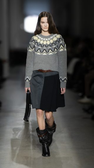 Giacche corte e dalle linee rigorose, maglioni argylle, cappotti sciancrati, gonne asimmetriche e maxi cardigan in lana dalla trama grossa sfilano alla Milano Fashion Week sulla passerella Autunno/Inverno 2025-2026 di Onitsuka Tiger