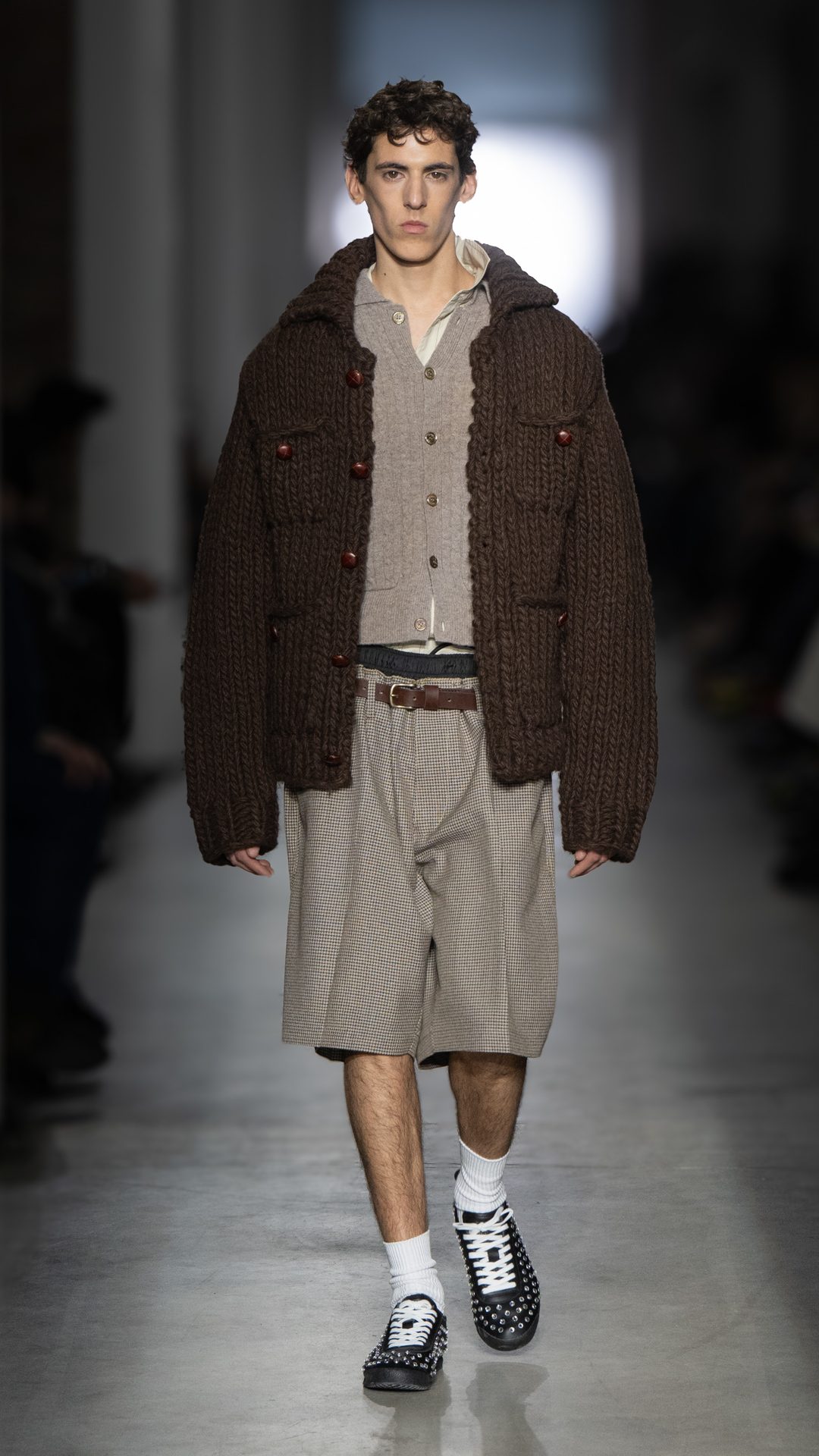 Giacche corte e dalle linee rigorose, maglioni argylle, cappotti sciancrati, gonne asimmetriche e maxi cardigan in lana dalla trama grossa sfilano alla Milano Fashion Week sulla passerella Autunno/Inverno 2025-2026 di Onitsuka Tiger