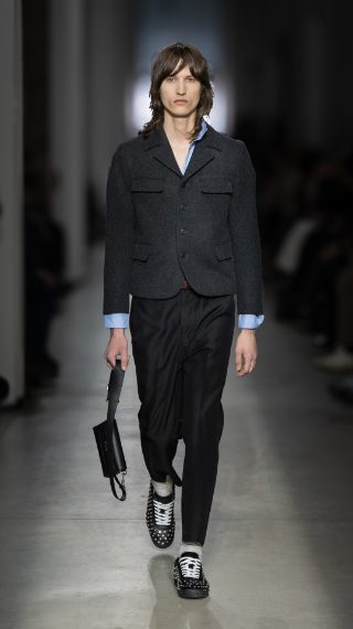 Giacche corte e dalle linee rigorose, maglioni argylle, cappotti sciancrati, gonne asimmetriche e maxi cardigan in lana dalla trama grossa sfilano alla Milano Fashion Week sulla passerella Autunno/Inverno 2025-2026 di Onitsuka Tiger