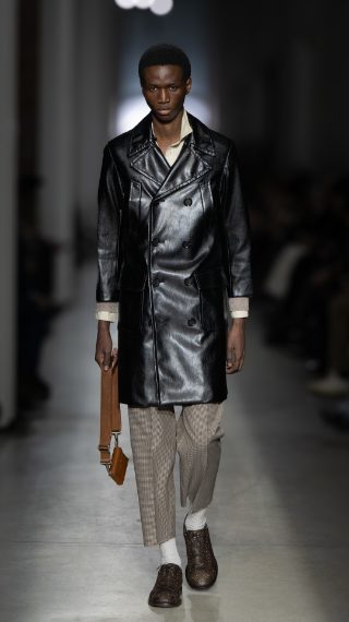 Giacche corte e dalle linee rigorose, maglioni argylle, cappotti sciancrati, gonne asimmetriche e maxi cardigan in lana dalla trama grossa sfilano alla Milano Fashion Week sulla passerella Autunno/Inverno 2025-2026 di Onitsuka Tiger
