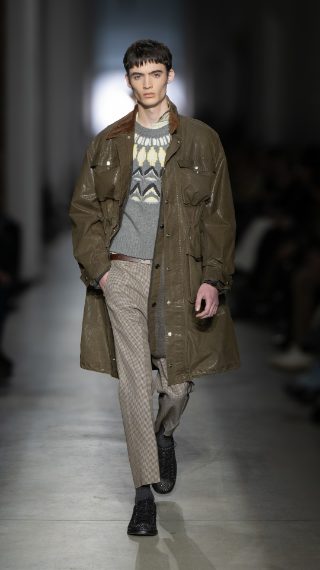 Giacche corte e dalle linee rigorose, maglioni argylle, cappotti sciancrati, gonne asimmetriche e maxi cardigan in lana dalla trama grossa sfilano alla Milano Fashion Week sulla passerella Autunno/Inverno 2025-2026 di Onitsuka Tiger