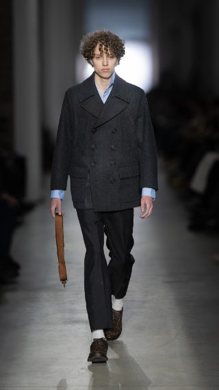 Giacche corte e dalle linee rigorose, maglioni argylle, cappotti sciancrati, gonne asimmetriche e maxi cardigan in lana dalla trama grossa sfilano alla Milano Fashion Week sulla passerella Autunno/Inverno 2025-2026 di Onitsuka Tiger