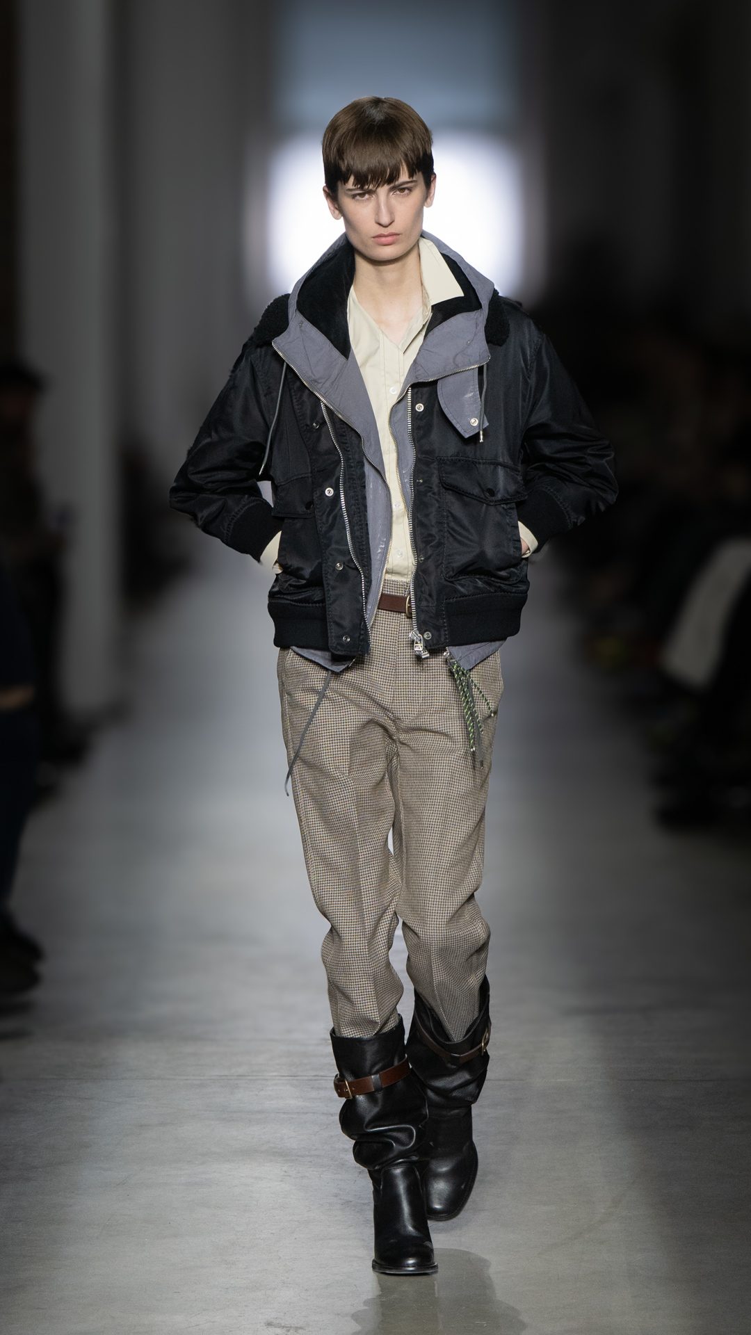 Giacche corte e dalle linee rigorose, maglioni argylle, cappotti sciancrati, gonne asimmetriche e maxi cardigan in lana dalla trama grossa sfilano alla Milano Fashion Week sulla passerella Autunno/Inverno 2025-2026 di Onitsuka Tiger