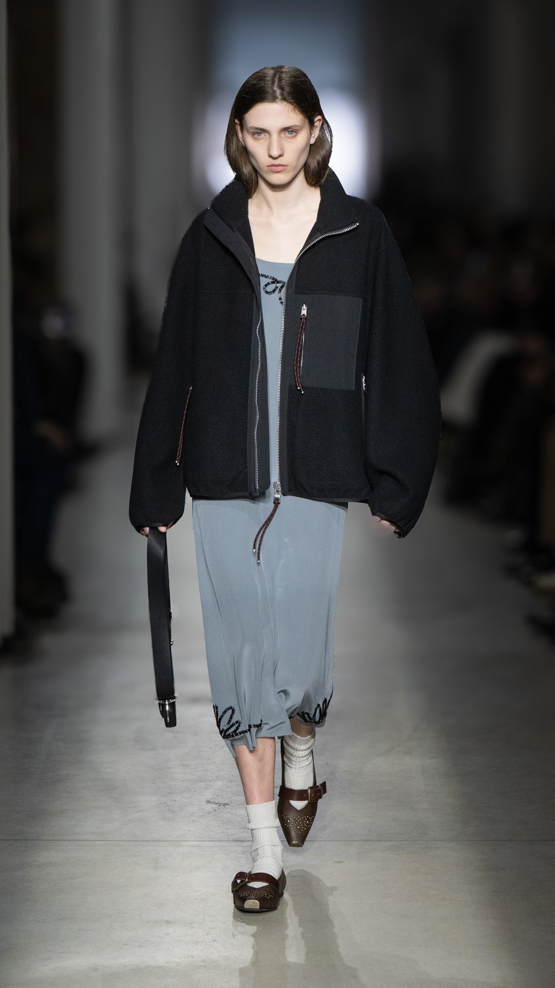 Giacche corte e dalle linee rigorose, maglioni argylle, cappotti sciancrati, gonne asimmetriche e maxi cardigan in lana dalla trama grossa sfilano alla Milano Fashion Week sulla passerella Autunno/Inverno 2025-2026 di Onitsuka Tiger