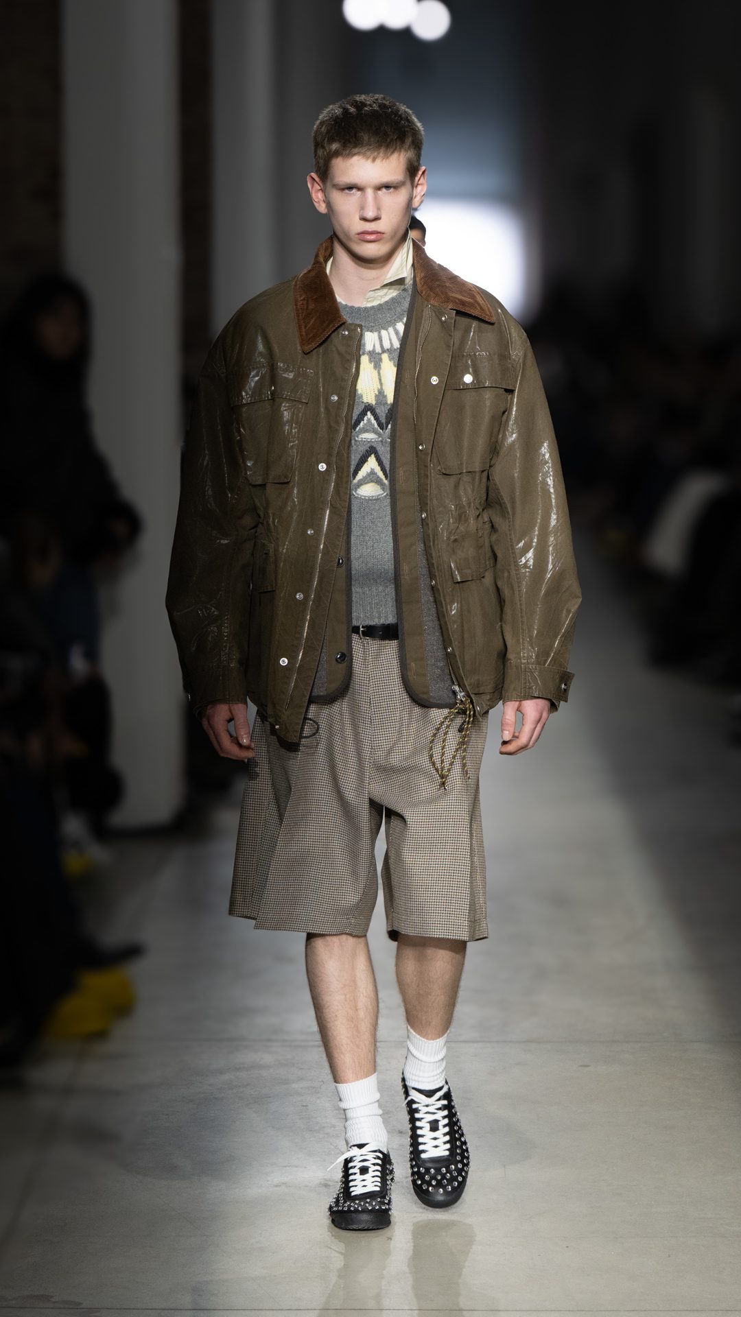 Giacche corte e dalle linee rigorose, maglioni argylle, cappotti sciancrati, gonne asimmetriche e maxi cardigan in lana dalla trama grossa sfilano alla Milano Fashion Week sulla passerella Autunno/Inverno 2025-2026 di Onitsuka Tiger