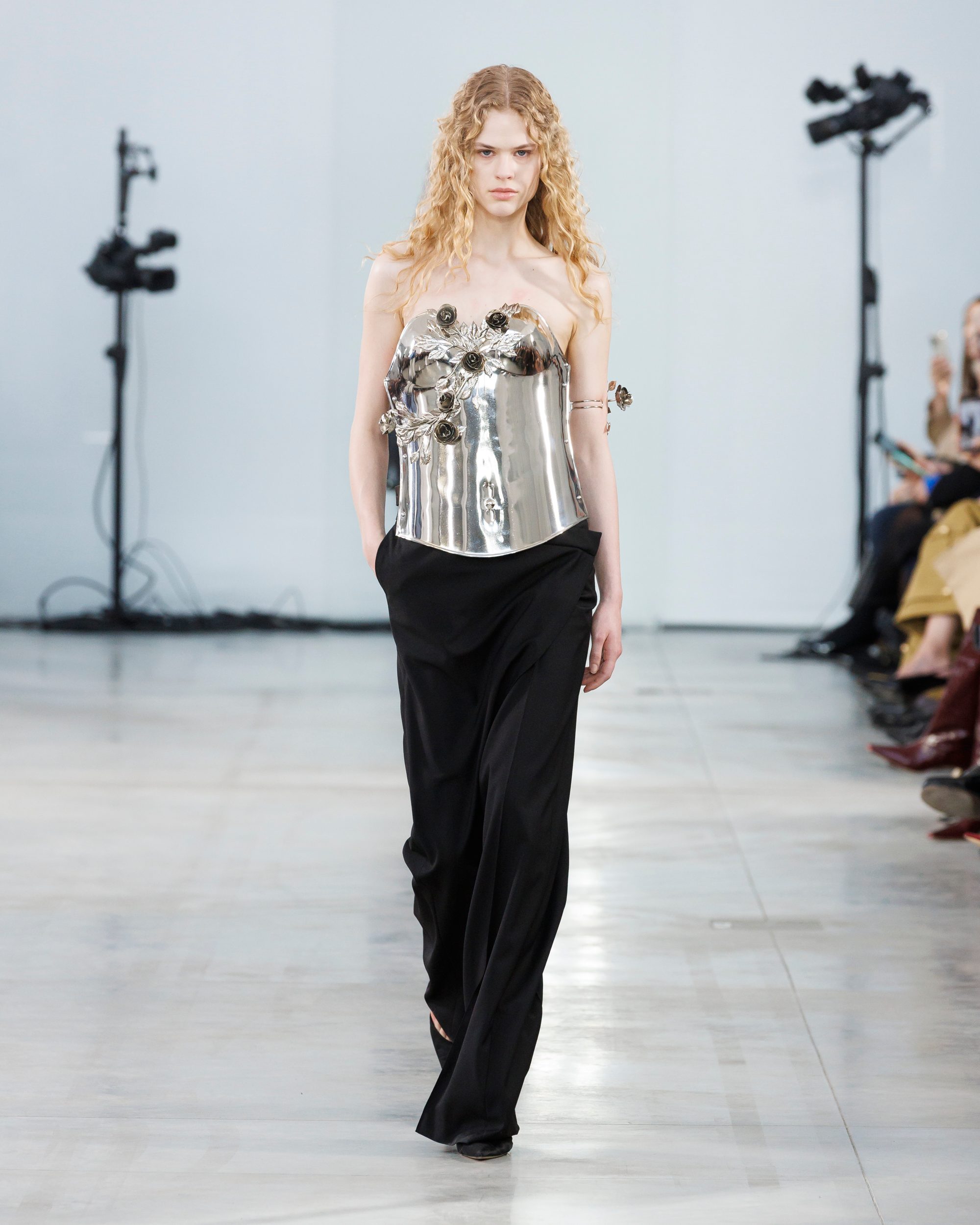 Completi in pelle arricciata e stropicciata, bustini metallici, spille argentate a forma di fiore, tubini in maglia e abiti coperti di cristalli sfilano alla Milano Fashion Week sulla passerella Autunno/Inverno 2025-2026 di Giuseppe Di Morabito