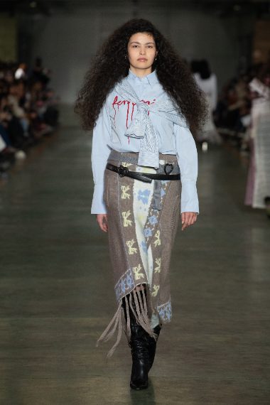 Completi, tubini e cardigan in lana a rombi si alternano a leggerissimi capi lingerie sulla passerella Autunno/Inverno 2025-2026 di Marco Rambaldi alla Milano Fashion Week
