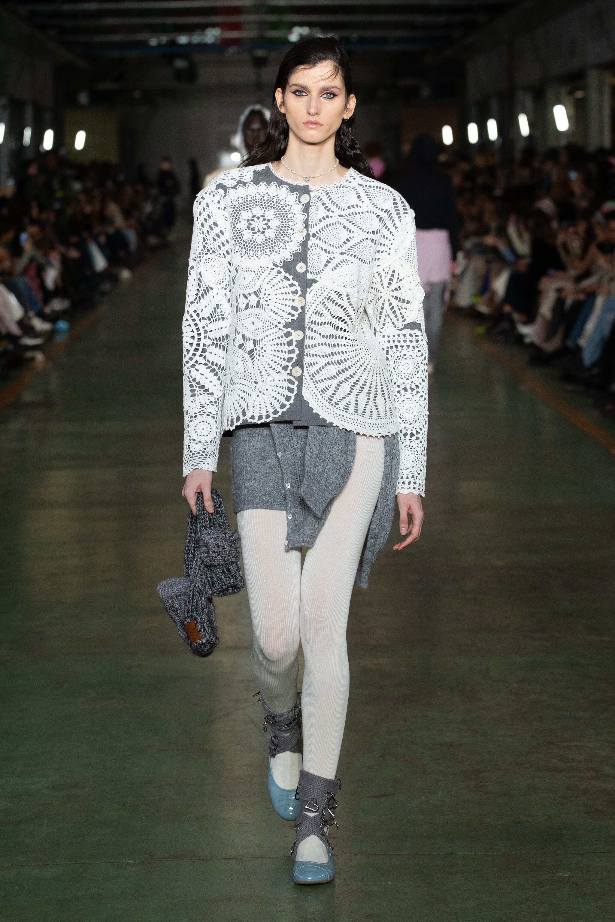Completi, tubini e cardigan in lana a rombi si alternano a leggerissimi capi lingerie sulla passerella Autunno/Inverno 2025-2026 di Marco Rambaldi alla Milano Fashion Week