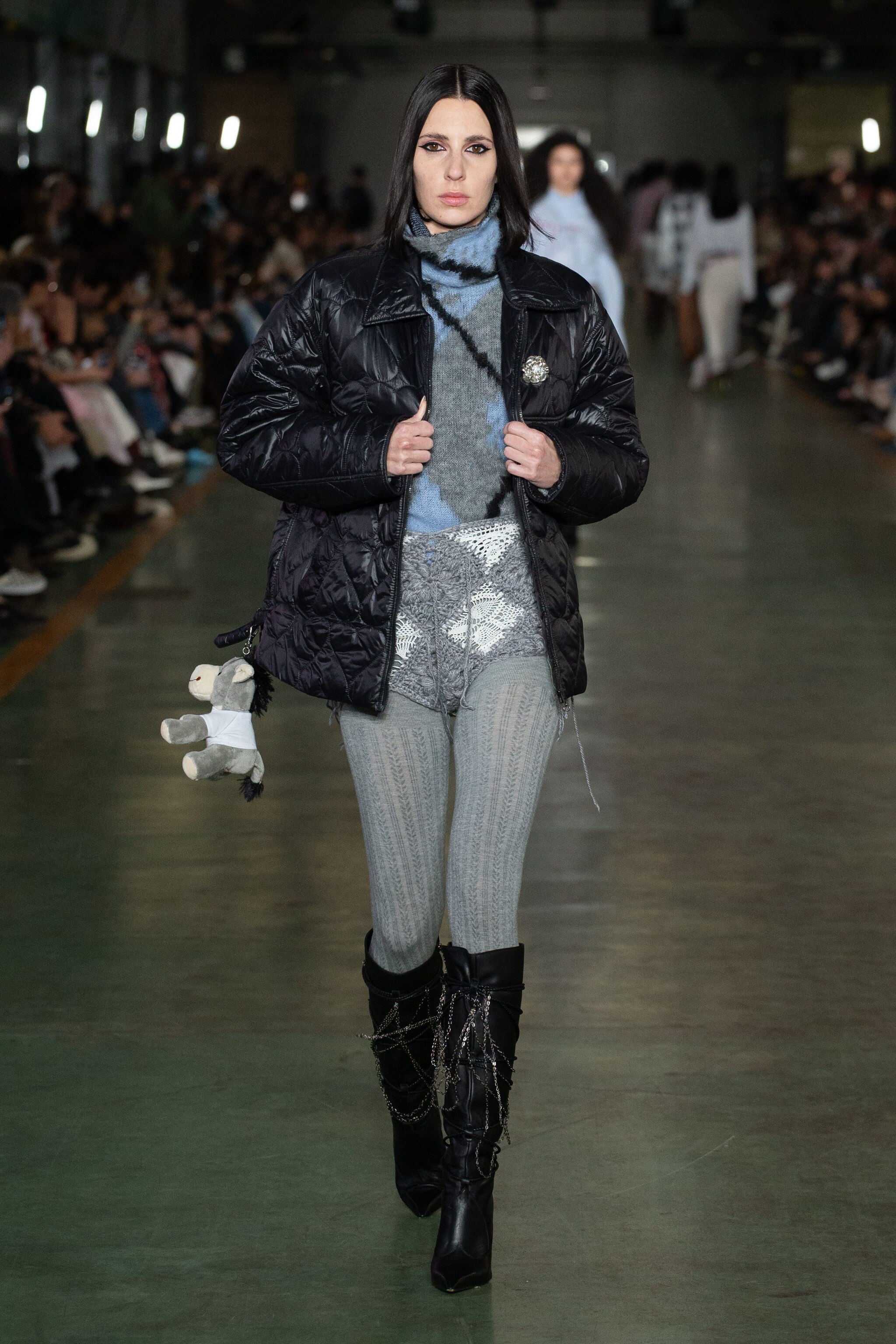 Completi, tubini e cardigan in lana a rombi si alternano a leggerissimi capi lingerie sulla passerella Autunno/Inverno 2025-2026 di Marco Rambaldi alla Milano Fashion Week