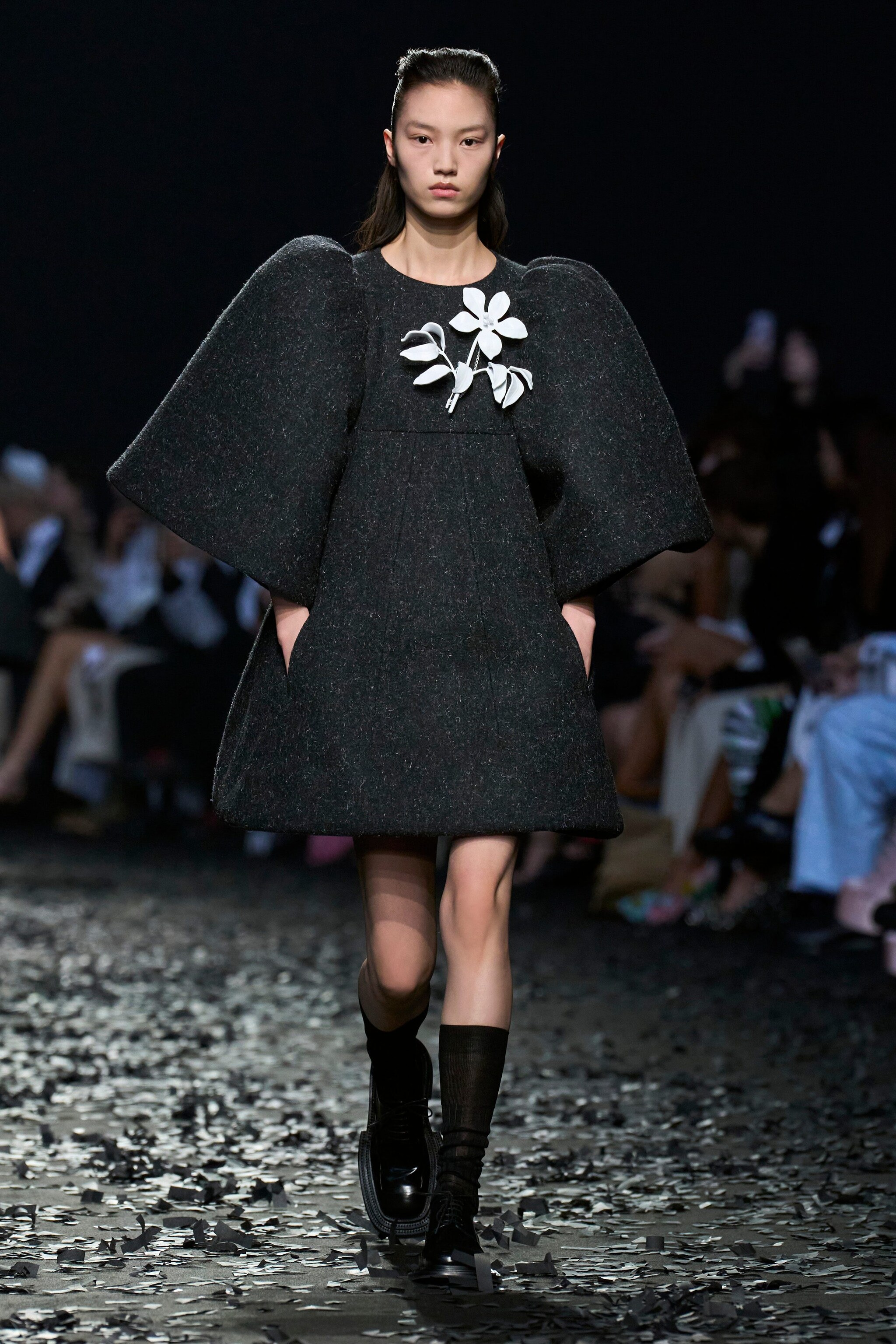 Cappotti sartoriali con cuciture a vista, abiti con spalline balloon, voluminosi piumini con stampe floreali e abiti a maxi shirt sfilano alla Milano Fashion Week sulla passerella Autunno/Inverno 2025-2026 di Moschino