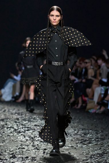 Cappotti sartoriali con cuciture a vista, abiti con spalline balloon, voluminosi piumini con stampe floreali e abiti a maxi shirt sfilano alla Milano Fashion Week sulla passerella Autunno/Inverno 2025-2026 di Moschino