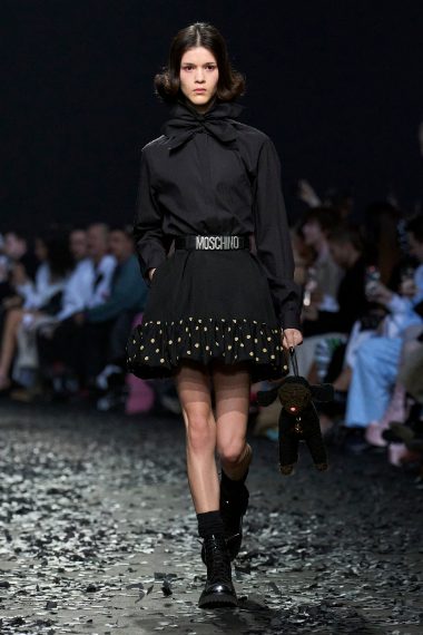Cappotti sartoriali con cuciture a vista, abiti con spalline balloon, voluminosi piumini con stampe floreali e abiti a maxi shirt sfilano alla Milano Fashion Week sulla passerella Autunno/Inverno 2025-2026 di Moschino