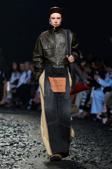 Cappotti sartoriali con cuciture a vista, abiti con spalline balloon, voluminosi piumini con stampe floreali e abiti a maxi shirt sfilano alla Milano Fashion Week sulla passerella Autunno/Inverno 2025-2026 di Moschino