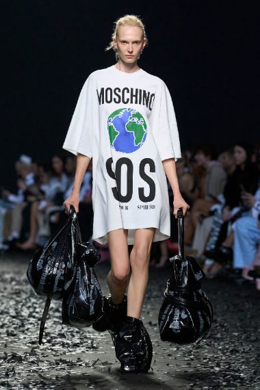Cappotti sartoriali con cuciture a vista, abiti con spalline balloon, voluminosi piumini con stampe floreali e abiti a maxi shirt sfilano alla Milano Fashion Week sulla passerella Autunno/Inverno 2025-2026 di Moschino